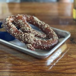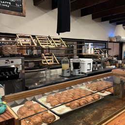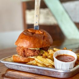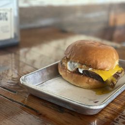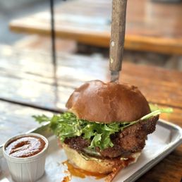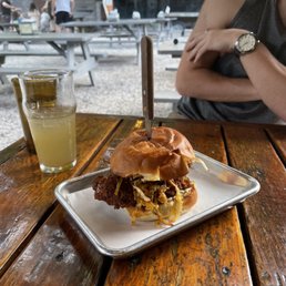 Highly recommend this spot. Plenty of space outside to work or mingle with people. Just hot in August. Then there were also some small tables and like three picnic tables inside in the AC. Didn't try the bakery but LOVED our lunch! I ordered the burger - two wagyu smash burger patties, american & pimento cheese, pickle, secret sauce, challah bun. It was life changing! My friend ordered the spicy chicken sandwich. She said is was delicious. Our cocktails were flavorful and maybe premade bc they came out fast!!! Only downside was you order with your phone and toastmasters is weird sometimes.